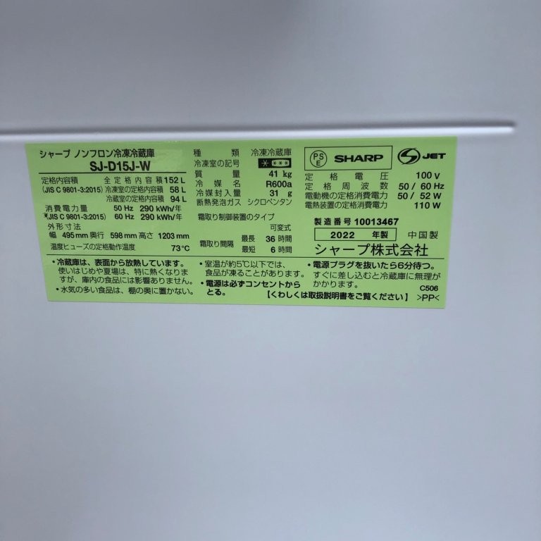 ご不要となった「SJ-D15J-W」は、シャープ製のノンフロン2ドア冷蔵庫。