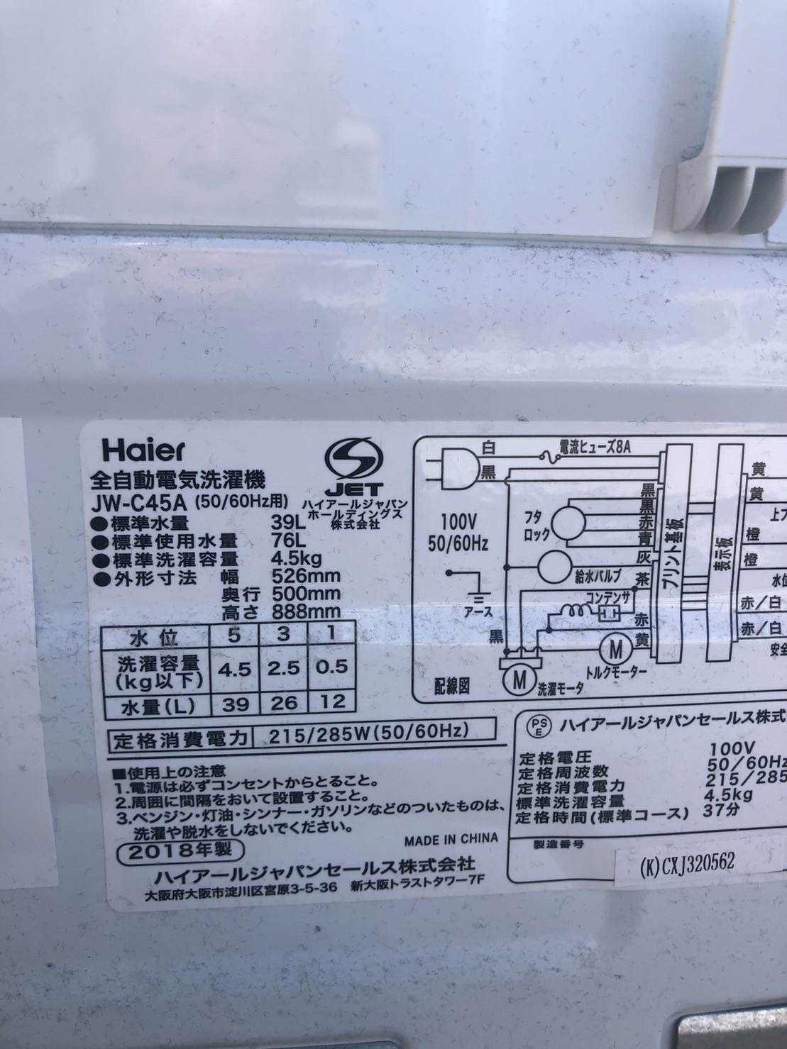 今回回収したのは、コンパクトで機能性に優れた Haier(ハイアール)製の全自動洗濯機 JW-C45A。